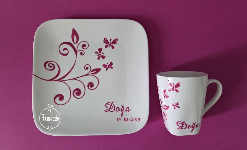 Verjaardagservies DogaBij de bewerking van dit verjaardagservies viel me de geboortedatum op. Doğa is inmiddels 12 jaar. Ik vroeg me af wat maakte dat haar moeder deze bestelling deed. Dat leverde al snel een enthousiast gesprek op. Zo vertelde Britt, de moeder van Doğa, dat ze 7 jaar geleden voor hun zoontje Arda een mooi geboorteservies hebben ontvangen. Dit servies heeft onlangs een mooie plek in een nieuwe kast in de woonkamer gekregen. Een leeg plekje ernaast is aanwezig, een servies voor hun dochter ontbreekt nog. Dus was het besluit snel genomen om ook voor hun dochter zichzelf een servies cadeau te doen. Helaas bleek degene die het servies voor hun zoon destijds gemaakt heeft niet meer actief. Via Google kwam Britt bij Femkado uit; gezien de stijl van het geboortekaartje en mijn stijl verwachtte ze hiermee een goede ‘match’ gevonden te hebben. En dat blijkt wel uit haar reactie over het eindresultaat: ze is er heel enthousiast over!